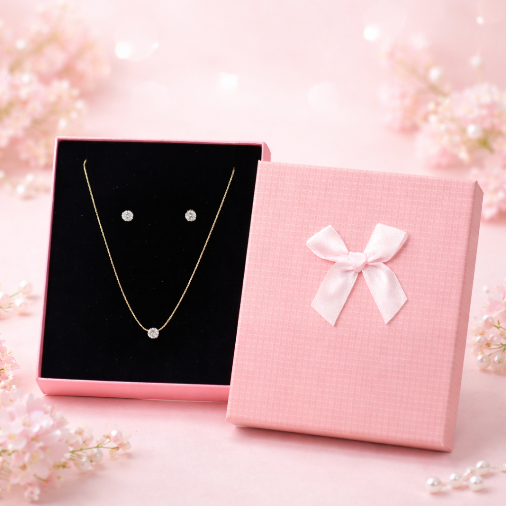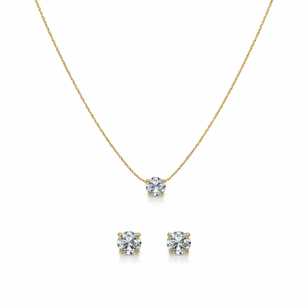 The 4-prong claw setting is significant — it is the most light-maximising mount for a round stone, exposing the maximum surface area from every angle. The CZ stone’s facet-cut surface catches and refracts light in a way that closely resembles genuine diamonds, particularly on an ultra-fine chain that removes visual competition around the stone. This is the effect the set is designed to deliver: stone-forward, uncluttered, effortlessly elegant.
