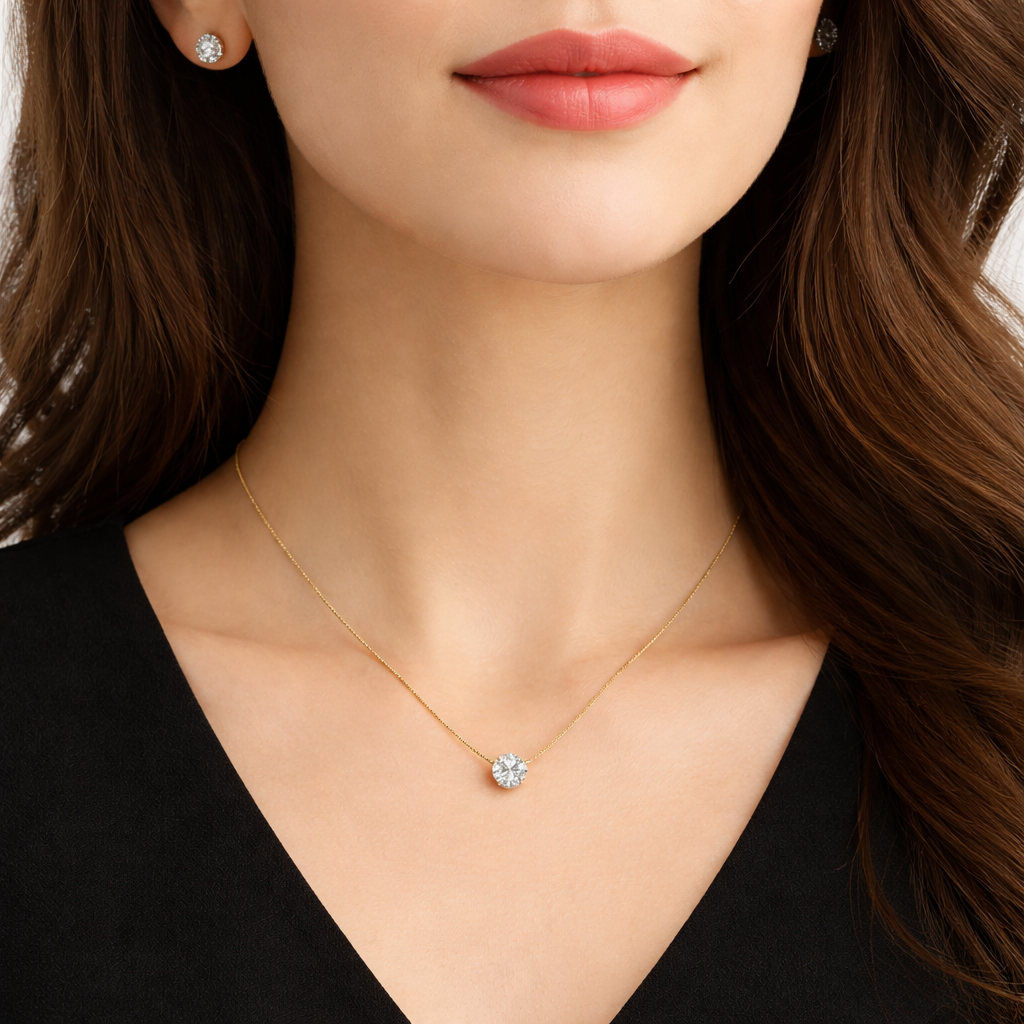 The BangleCart Elegant Gold-Plated Solitaire Pendant Set is crafted for women who want the look of fine diamond jewellery without the price. A large round CZ stone sits in a classic 4-prong claw setting — the same mount used in genuine diamond solitaire necklaces — suspended from an ultra-fine gold cable chain that seems to disappear against the skin, making the stone appear to float at the collarbone. The matching oversized claw-set solitaire stud earrings use the same stone size and setting, creating a coordinated set where every element is intentionally designed to look like it belongs together.