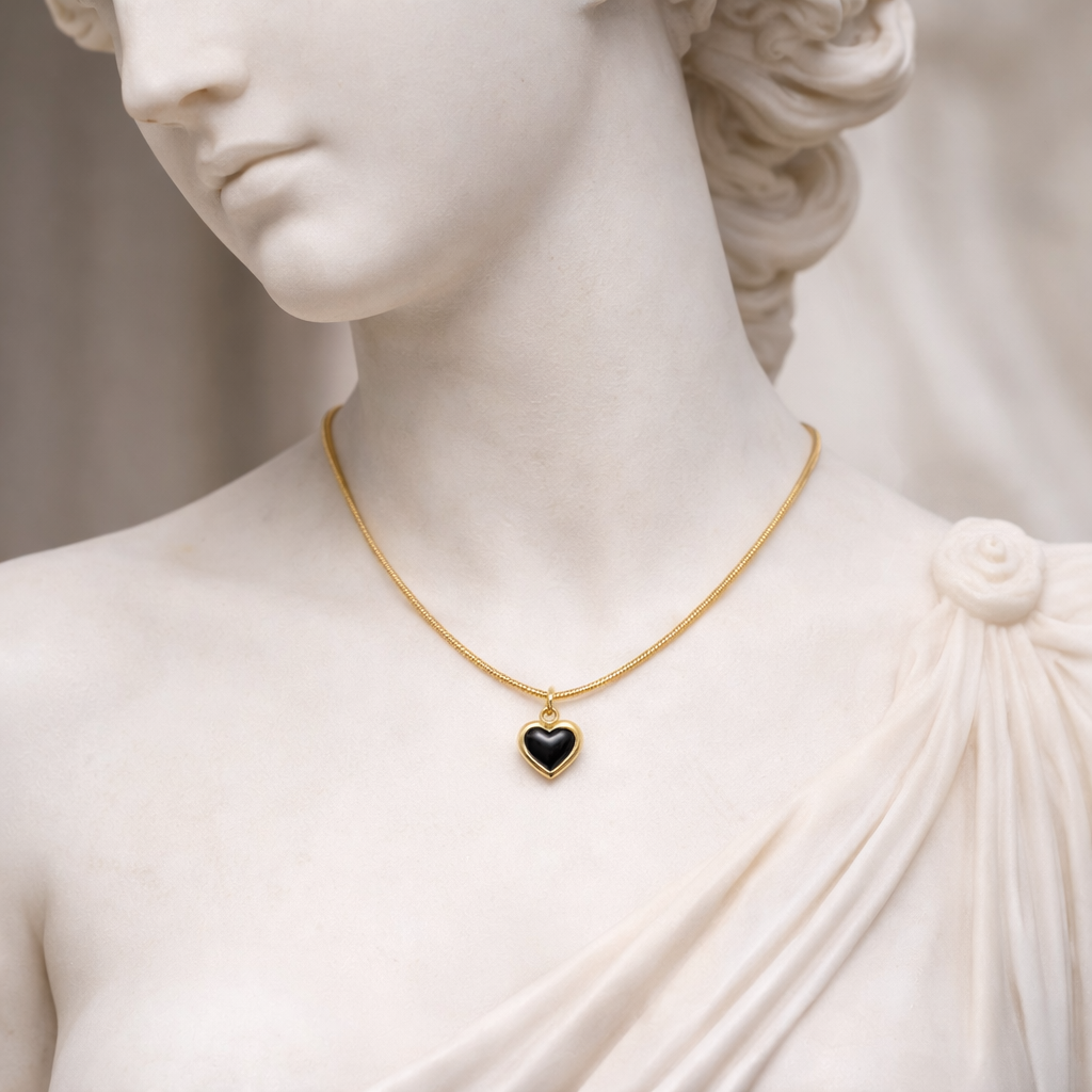 Add bold elegance to your jewelry collection with this gold black heart pendant necklace, designed to blend modern style with timeless charm. The glossy black heart centerpiece is beautifully framed in a polished gold-tone setting, creating a striking contrast that feels both sophisticated and stylish.